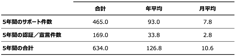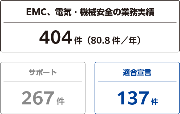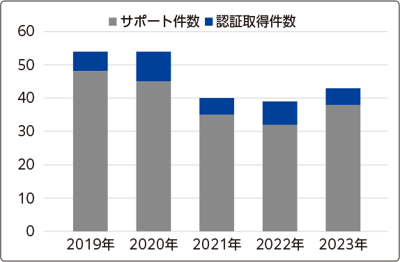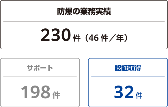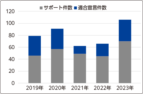 弊社サービスの中でご利用の多い「防爆」と「EMC、電気・機械安全」について、2019年〜2023年までの過去5年間の実績をご紹介します。なお、サポート件数は、年で区切ることが難しいため、年ごとの延べ件数を算出しています。